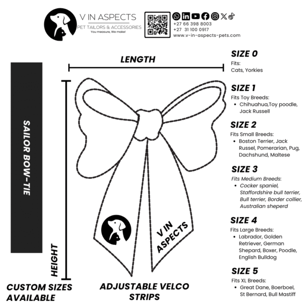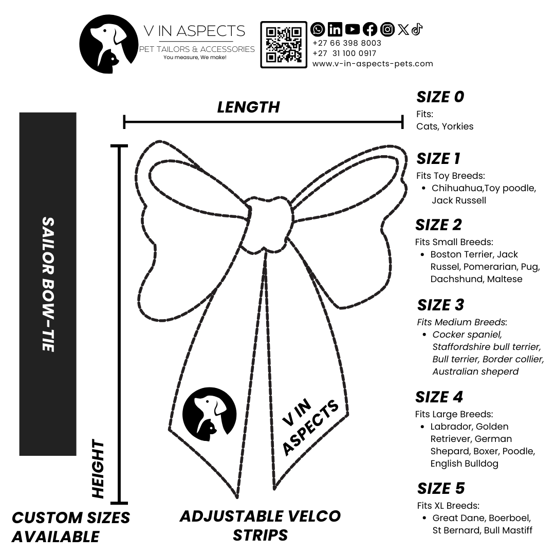 The perfect fit sits proudly at the collar. Our comprehensive sizing spans from Size 0 for cats and tiny pups to Size 5 for giant breeds like Boerboels. Finding the right size is simple: measure your dog’s front-facing part of the neck and match it to our detailed chart. Pro Tip: If your dog is between sizes or has a very thick neck, sizing up ensures comfort and a proper drape of the tails. This ensures your sailor gets a bow tie that’s both comfortable and proportionally perfect.