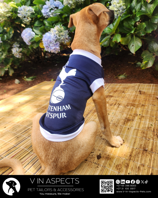 Let’s see what makes this dog t-shirt special. The standard round neck is carefully measured for all-day comfort. The choice between breathable summer fabric or cozy winter fleece provides lightweight airflow or optimal temperature regulation while offering moisture-wicking comfort or durable yet gentle texture for your dog’s skin. Our thoughtful seasonal design makes it the ideal layer for summer or winter weather options while keeping the same quality design. Whether your dog is playing or relaxing, they can do it in ultimate comfort and style. The classic navy blue fabric—synonymous with Spurs’ distinguished look—is perfectly accented with crisp white trimmings on the sleeves and bottom hem, creating a clean, elegant, and unmistakably Tottenham aesthetic that echoes the club’s timeless kit tradition. The design is anchored by the legendary Tottenham Hotspur club crest, featuring the iconic cockerel standing proudly atop a football—a symbol of the club’s fighting spirit and rich history dating back to 1882. Whether your dog is holding the line at the dog park or relaxing in their favorite spot, they can do it with classic style and all-day comfort.