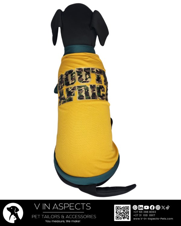 Let’s see what makes this dog t-shirt special. The standard round neck is carefully measured for all-day comfort. The choice between breathable summer fabric or cozy winter fleece provides lightweight airflow or optimal temperature regulation while offering moisture-wicking comfort or durable yet gentle texture for your dog’s skin. Our thoughtful seasonal design makes it the ideal layer for summer or winter weather options while keeping the same quality design. Whether your dog is playing or relaxing, they can do it in ultimate comfort and style. The warm mustard fabric—a bold and vibrant nod to the golden element of South Africa’s sporting colors—is strikingly accented with rich bottle green trimmings on the sleeves and bottom hem, creating a look that’s both distinctive and instantly recognizable as a celebration of Mzansi’s national pride. The design is anchored by the proud words “South Africa” rendered in striking camouflage print—a unique and edgy tribute to the Rainbow Nation that captures both patriotism and modern style, perfect for the team known as “The Boys.” Whether your dog is holding the line at the dog park or relaxing in their favorite spot, they can do it with Bafana Bafana style and all-day comfort.