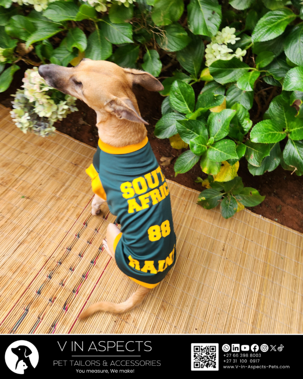 Let’s see what makes this dog t-shirt special. The standard round neck is carefully measured for all-day comfort. The choice between breathable summer fabric or cozy winter fleece provides lightweight airflow or optimal temperature regulation while offering moisture-wicking comfort or durable yet gentle texture for your dog’s skin. Our thoughtful seasonal design makes it the ideal layer for summer or winter weather options while keeping the same quality design. Whether your dog is playing or relaxing, they can do it in ultimate comfort and style. The rich bottle green fabric—synonymous with the Springboks’ proud heritage, from the days of François Pienaar to the modern era of Siya Kolisi and back-to-back World Cup glory—is elegantly accented with stunning yellow-gold trimmings on the sleeves and bottom hem, creating a look that’s both regal and instantly recognizable as the colors of a champion. The design is anchored by the proud words “South Africa” rendered in bold yellow-gold—a declaration of national pride that needs no further explanation. Whether your dog is holding the line at the dog park or relaxing in their favorite spot, they can do it with Bokke style and all-day comfort.