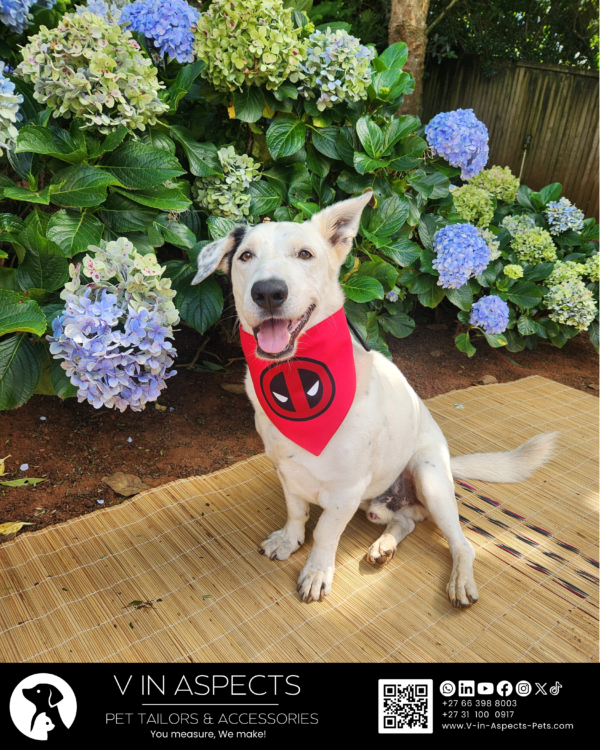Let’s see what makes this dog superhero bandana a must-have for any Deadpool fan. We chose a bold red that looks great on all dogs and captures the essence of everyone’s favorite Merc with a Mouth—the color of chaos, of regeneration, of the suit that has become synonymous with fourth-wall-breaking humor and unexpected heart. The instantly recognizable Deadpool face is the centerpiece—those expressive white eyes that somehow convey more emotion than most actors can with their whole face, that mask that hides the scarred face of Wade Wilson but reveals his personality with every glance. It’s the same look that has graced comic book covers for decades and been brought to life memorably by Ryan Reynolds on the big screen. The striking black tie-around straps add the perfect complementary contrast, echoing the black holsters, belts, and accents of Deadpool’s costume and creating a look that’s both edgy and unmistakably Deadpool. Our practical tie-on system gives a secure and comfortable fit that stays in place during even the most chaotic chimichanga hunts. Making our dog superhero bandanas great to wear all day, whether your dog is breaking the fourth wall or relaxing in their favorite spot. They can do it in style.