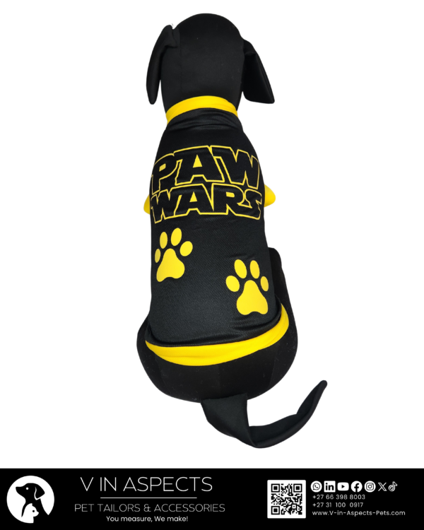 Let’s see what makes this dog t-shirt special. The standard round neck is carefully measured for all-day comfort. Choose between our breathable summer fabric for lightweight airflow and moisture-wicking comfort, or our cozy winter fleece for optimal temperature regulation and a gentle texture against your dog’s skin. Our thoughtful seasonal design makes it the ideal layer for summer adventures or winter missions, all while keeping the same high-quality, galaxy-famous style. Whether your dog is playing with their lightsaber toy or relaxing after saving the galaxy, they can do it in ultimate comfort. The sleek black fabric—perfect for blending into the shadows of the Death Star or the forests of Endor—is dramatically accented with striking lemon yellow trimmings on the sleeves and bottom hem, creating a bold contrast that echoes the iconic Star Wars aesthetic and the glowing energy of a lightsaber. The design is anchored by the playful words “Paw Wars” rendered in the legendary Star Wars font—that iconic, instantly recognizable lettering that transports any fan straight to a galaxy far, far away. Whether your dog is joining the Rebel Alliance or embracing the dark side, they can do it with galactic style and all-day comfort.
